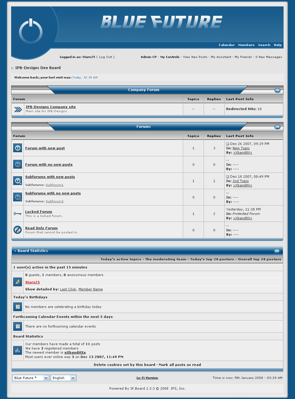 Stars25 Posted January 9, 2008 Posted January 9, 2008 i am almost done with this skin and i want to see what people think about it so far. this is just a picture of the board index since its not done in other parts. any constructive criticism and suggestions are always welcome