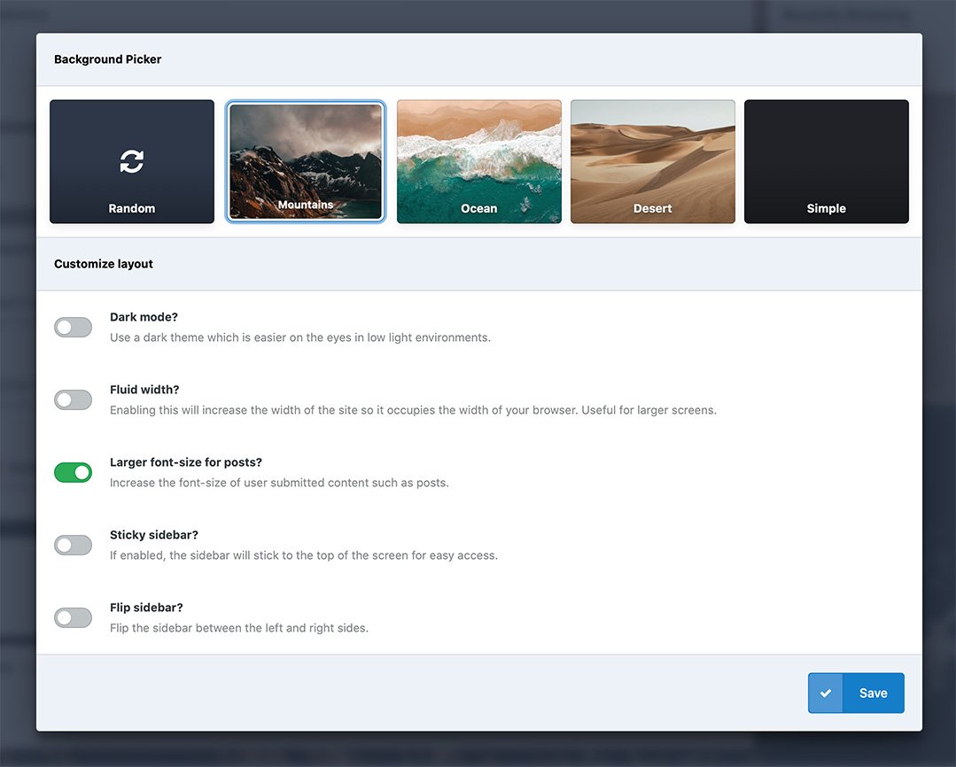 Ehren Posted August 4, 2020 Posted August 4, 2020 Hi everyone! Following on from the last sneak peak (the new Background Picker), here's another sneak peak to show off a new feature in 4.5 - The Customizer. Yet to be officially named (feel free to post your suggestions below), the Customizer allows your members to customize your theme based on their own preference. Clicking the toggle icon in the user panel will open a modal box which contains the Background Picker and a list of toggle options. This list of settings will adapt based on which features you've enabled via the admin panel. If you've enabled the Countdown feature for example, a new item called "Show Countdown?" will appear in the Customizer allowing your members to hide the countdown if it doesn't apply to them. Each setting is saved as a cookie which persists across ipsfocus themes, so flipping the sidebar on one theme will flip it on all other ipsfocus themes too. If there are any settings which you'd like to see added to this list, make sure to post them below! 6