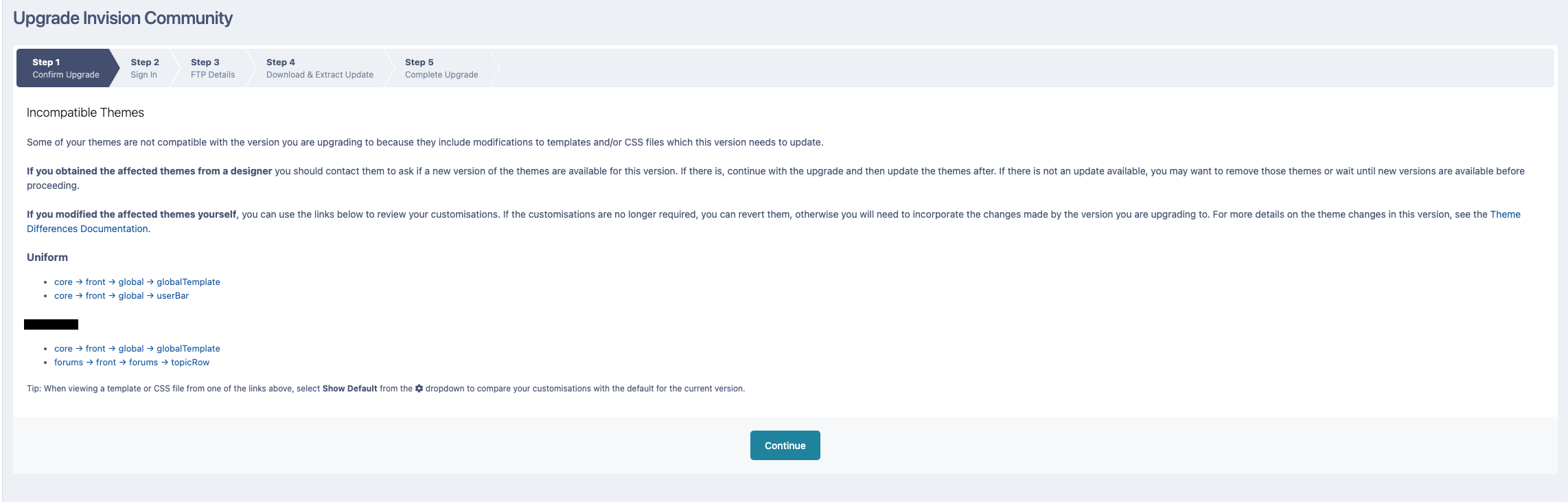 Ehren Posted July 29, 2022 Author Posted July 29, 2022 Hi @Jneow You should upgrade your software first, then upgrade your theme. The software just tells you what files need to be modified - it can’t actually determine if they’re compatible or not at that stage