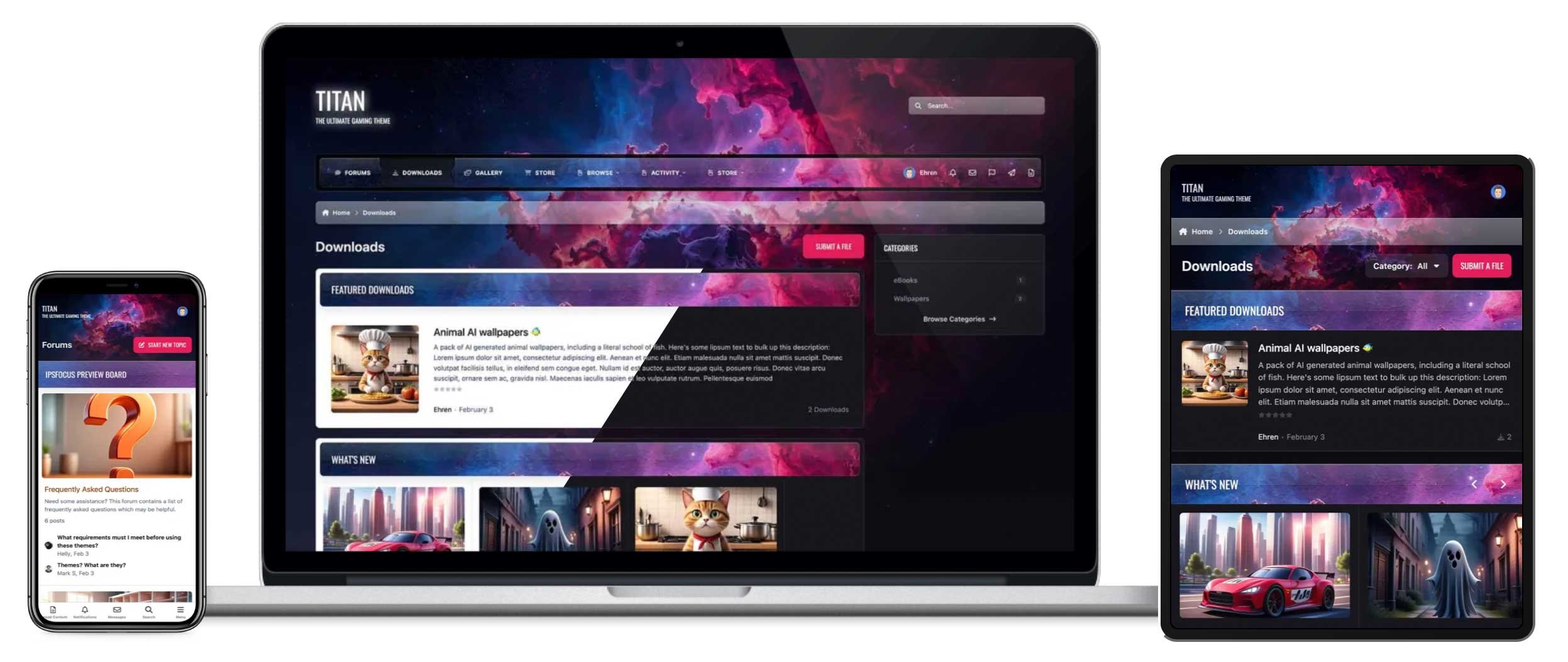 Ehren Posted August 13 Posted August 13 Titan: Now available for Invision Community 5 Titan is the ultimate gaming theme, based upon a large wallpaper image which is blurred behind textured navigation and category bars. Easily upload your own image via the resources area to completely change the colour scheme! Titan has been coded from scratch for Invision Community v5 and introduces a brand new light mode which sits alongside the dark mode which v4 customers will be familiar with. Take a look at the demo and feel free to leave your feedback or suggestions below! 4